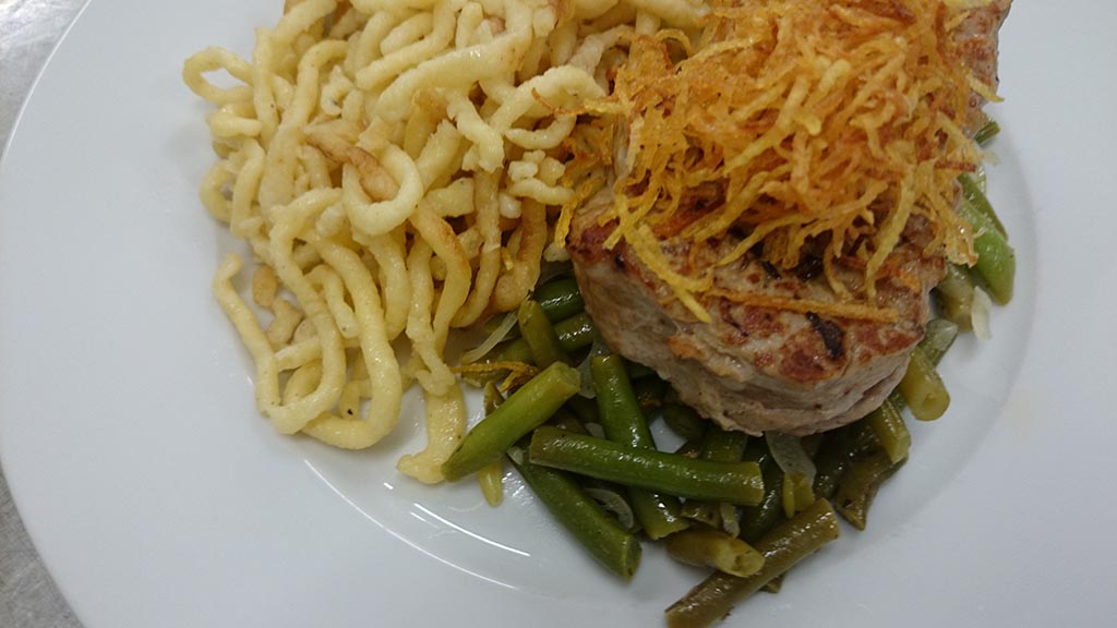 - Zartes Kalbsrückensteak unter Kartoffelstroh an einer Whisky-Orangensauce mit Speckbohnenröllchen und hausgemachten Spätzle