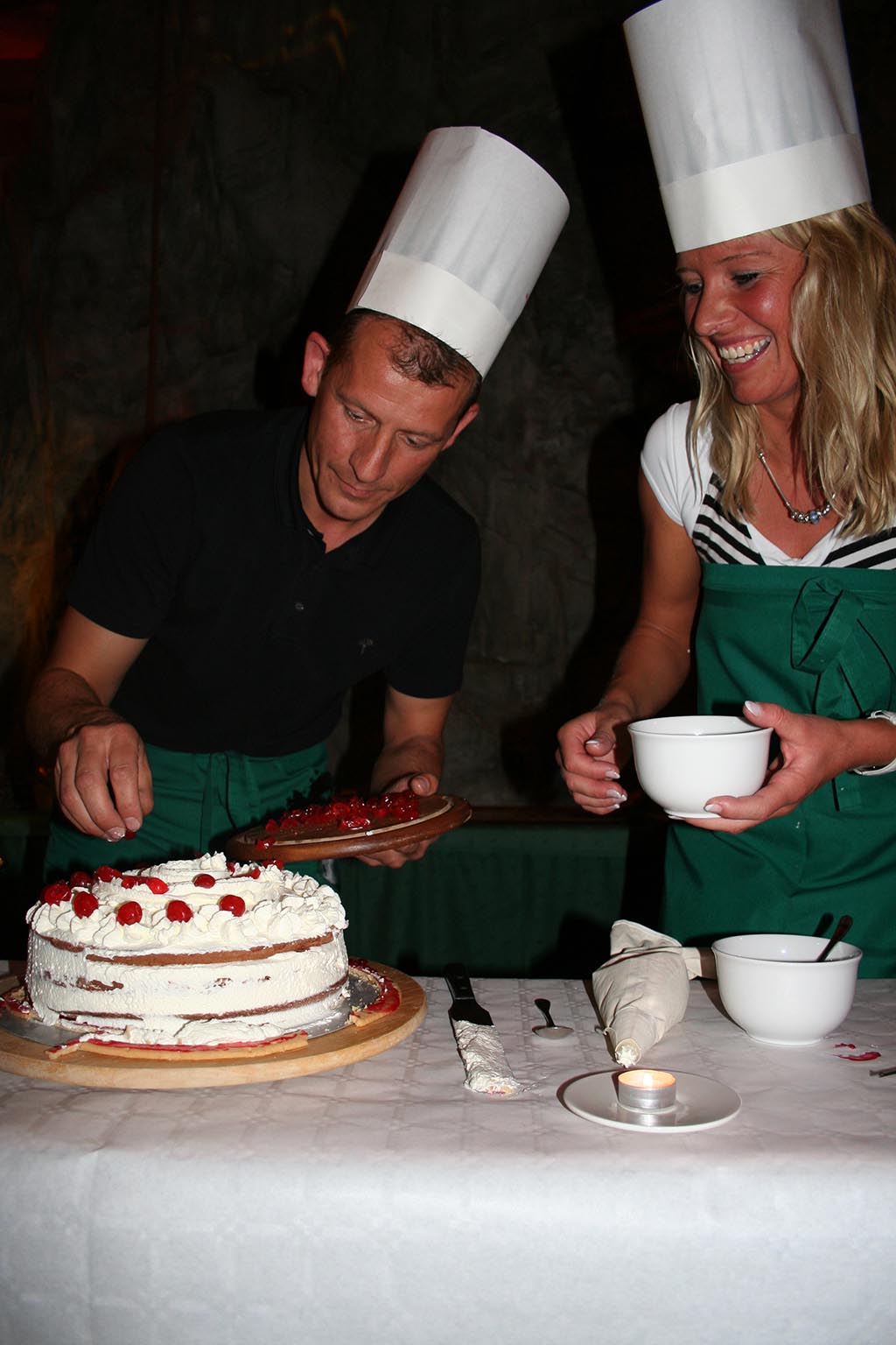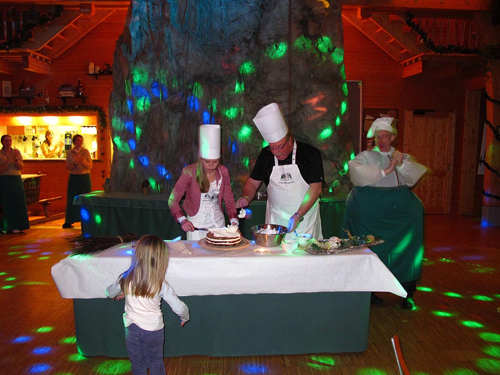 Unser Bäckermeister holt sich seine Gehilfen unter Ihren Gästen, kleidet sie ein und los geht´s. Unter tosendem Applaus und tollen Rhythmen entsteht in kürzester Zeit eine echte Schwarzwälder-Kirschtorte, die im Anschluss von Ihren Gästen verköstigt werden kann.